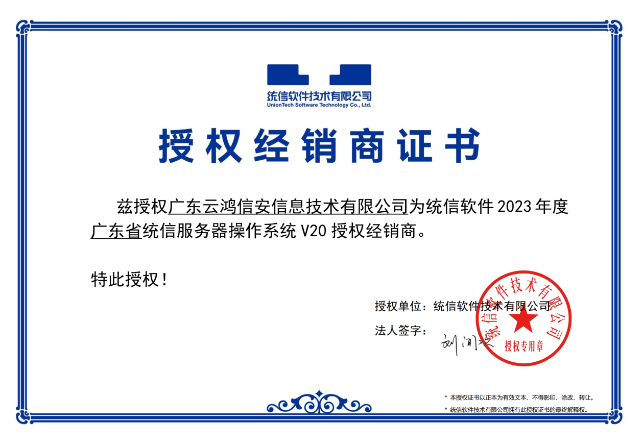 云鸿信安获广东省统信服务器操作系统V20授权经销商